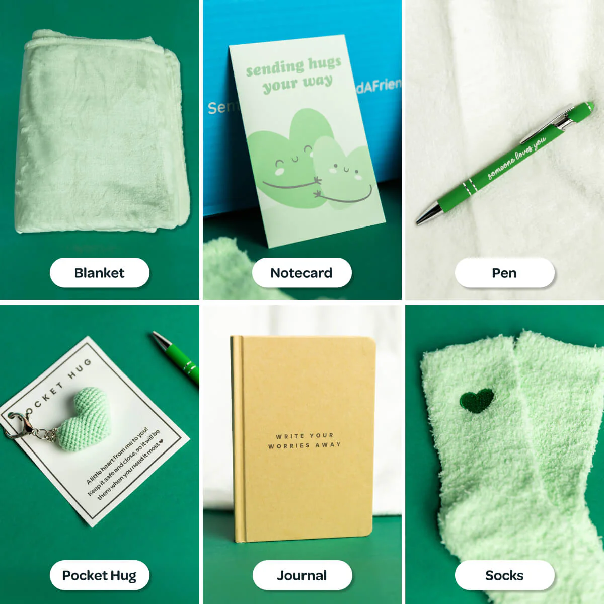 When words fall short, offer a gentle embrace for life's hardest moments. This bundle features the fluffy friend of your choice, a cozy blanket, fuzzy socks, journal and pen, and a small pocket hug to carry anywhere.